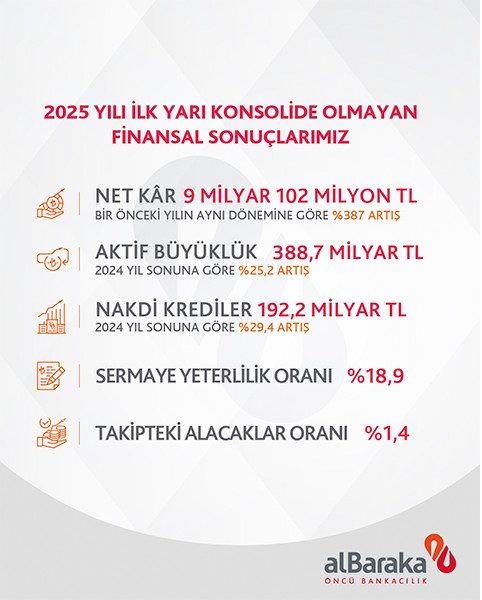 Türkiye’nin ilk katılım bankası Albaraka Türk, 2025 yılının ilk yarısında konsolide olmayan finansal sonuçlara göre 9 milyar 102 milyon TL net kâr açıkladı. Yılın ilk yarısında sağlanan bu güçlü performans, bankanın katılım bankacılığı prensiplerine bağlı kalarak sürdürülebilir büyüme hedefini destekliyor.