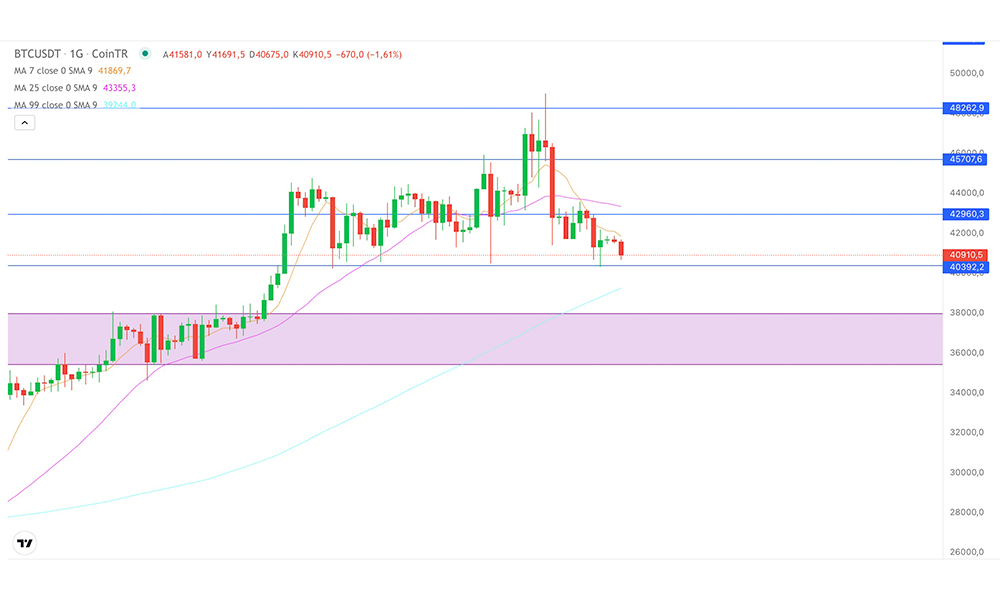 Gelelim teknik analize; Bitcoin ve Ethereum bu sabah saatlerinde önemli destek seviyelerinde bulunuyor. Bitcoin için ilk destek seviyesi 40.392 dolar olarak belirlenmişken, Ethereum için 2.448 dolarlık seviye kritik. Her iki kripto paranın da bu destek seviyelerini koruyup koruyamayacağı, piyasanın gelecekteki yönünü belirleyecek.