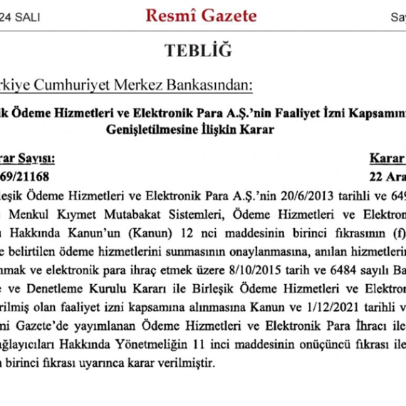 TCMB, Birleşik Ödeme Hizmetleri ve Elektronik Para A.Ş.’nin Faaliyet İzin Kapsamını Genişletti....
