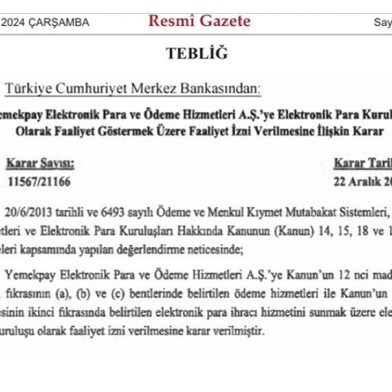 TCMB, Yemekpay’e Elektronik Para Kuruluşu Olarak Faaliyet İzni Verdi....