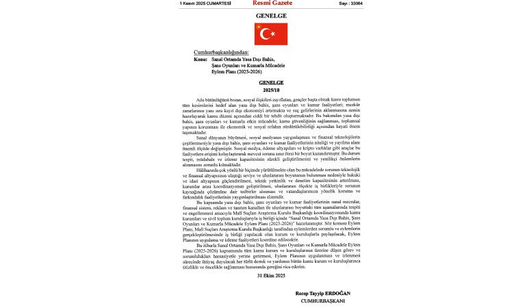 Cumhurbaşkanlığı tarafından 31 Ekim 2025 tarihinde yayımlanan 2025/18 sayılı Genelge, “Sanal Ortamda Yasa Dışı Bahis, Şans Oyunları ve Kumarla Mücadele Eylem Planı (2025–2026)” başlığıyla Resmî Gazete’de yer aldı.