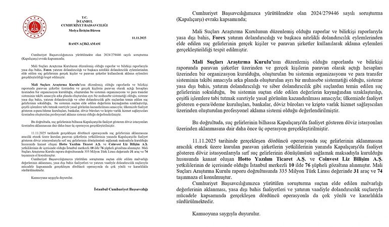 İstanbul Cumhuriyet Başsavcılığı, suçtan elde edilen malvarlıklarının aklanması ve finansal dolandırıcılıkla mücadele kapsamında yürütülen bu dördüncü operasyonun çok yönlü ve kararlılıkla sürdürüldüğünü açıkladı.