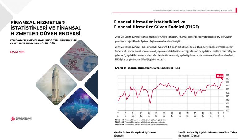Türkiye Cumhuriyet Merkez Bankası’nın (TCMB) Kasım 2025 Finansal Hizmetler İstatistikleri ve Finansal Hizmetler Güven Endeksi (FHGE) sonuçları açıklandı. Finansal sektörde 147 kurumun yanıtlarıyla hesaplanan endeks, Kasım ayında bir önceki aya göre 3,8 puan artarak 184,6 seviyesine ulaştı. Bu seviye, finansal hizmetler sektörünün genelinde iyimser bir görünüm olduğunu işaret ediyor. 100’ün üzerindeki değerler sektör güveninde iyimserliğe, 100’ün altı ise olumsuz görünüme işaret ediyor.