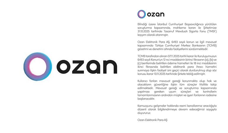 Kamuoyuyla paylaşılan açıklamada, TCMB’nin 07 Kasım 2025 tarihli kararıyla 6493 sayılı Kanun’un ilgili maddeleri uyarınca Ozan Elektronik Para’nın ödeme hizmetleri ve elektronik para ihracı faaliyet izinlerinin geçici olarak durdurulduğu belirtildi. Söz konusu kararın 10 Kasım 2025 tarihinde şirkete tebliğ edildiği bilgisi verildi.