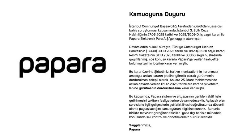 Papara tarafından yapılan kamuoyu duyurusunda, İstanbul Cumhuriyet Başsavcılığı tarafından yürütülen yasa dışı bahis soruşturması kapsamında İstanbul 3. Sulh Ceza Hakimliği’nin 27 Mayıs 2025 tarihli ve 2025/5209 Değişik İş sayılı kararıyla şirkete kayyum atandığı hatırlatıldı. Bu sürecin devamında, Türkiye Cumhuriyet Merkez Bankası’nın 30 Ekim 2025 tarihli ve 11929/21528 sayılı kararıyla Papara’ya verilen faaliyette bulunma izninin iptal edildiği, söz konusu kararın 31 Ekim 2025 tarihli Resmî Gazete’de yayımlandığı bilgisi paylaşıldı.