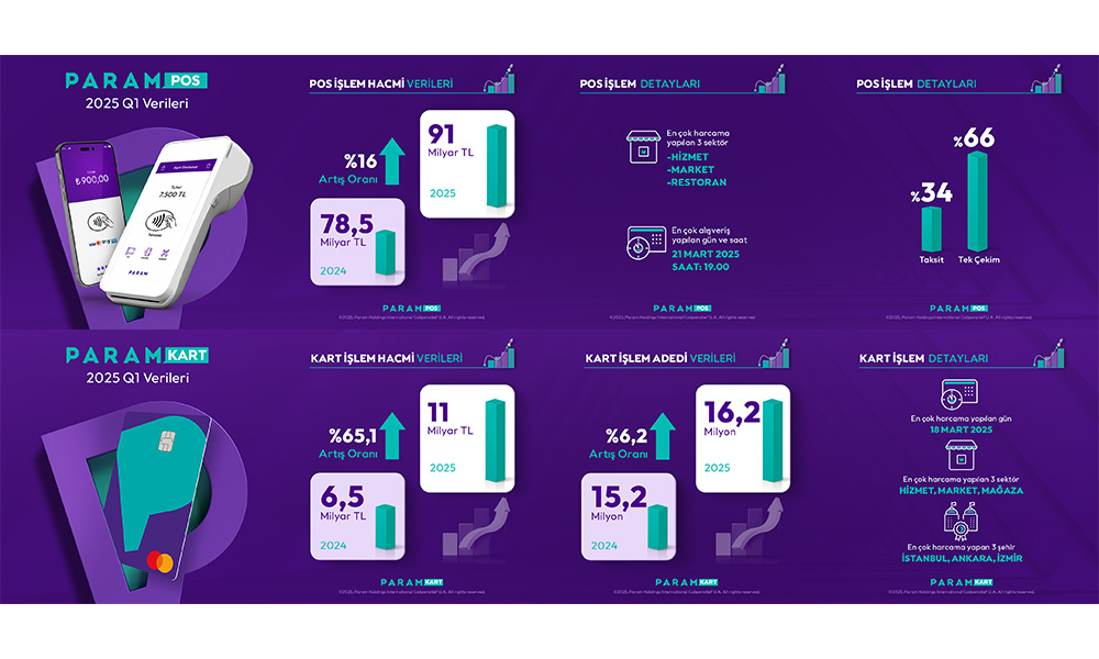 ParamPOS, 2025’in ilk çeyreğinde geçen yılın aynı dönemine göre yüzde 16 artış kaydederek 91 milyar TL’lik işlem hacmine ulaştı. İşlemlerin yüzde 34’ü taksitli, yüzde 66’sı ise tek çekim olarak gerçekleştirildi. En fazla harcama Muhtelif ve Spesiyalite Perakende Satış Dükkanları, Çeşitli Yiyecek Dükkanları ile Yemek Yerleri ve Restoranlar kategorilerinde yapıldı. Üye iş yeri sayısı 100 bini aşarken, ParamPOS’un en yoğun kullanıldığı tarih 21 Mart 2025 olarak kayıtlara geçti.